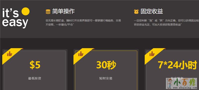 期权投资,一个简单便捷的投资方式x b a i x i n g c o m。不用高门槛,只需5美元起投;没有复杂的幅度,只需看对涨跌方向就能赚;不需要太多时间和精力,短短30秒即可完成一次获利投资。